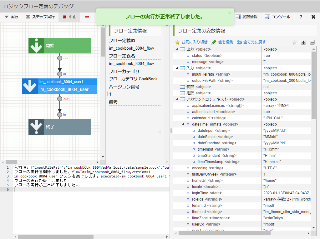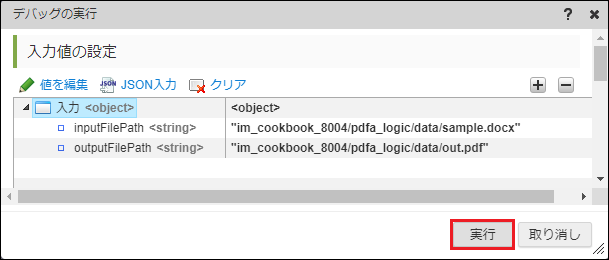 変数 値 inputFilePath im_cookbook_8004/pdfa_logic/data/sample.docx outputFilePath im_cookbook_8004/pdfa_logic/data/out.pdf < JSON入力 >