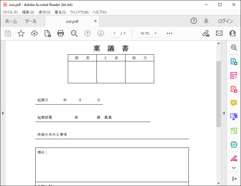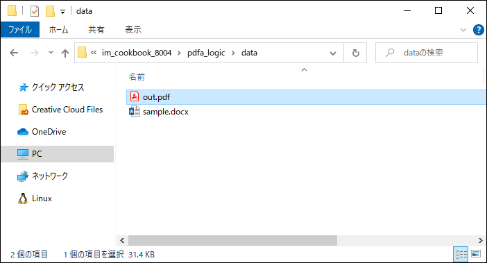 「outputFilePath」に指定した出力先に、PDFファイルが出力されていることを確認します。