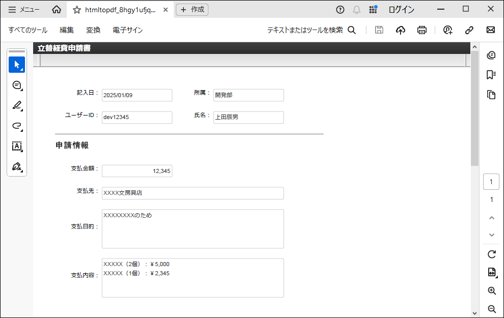 出力されたPDFファイルをPDFビューア( Adobe Acrobat Reader など)で開き、正しく表示されることを確認します。