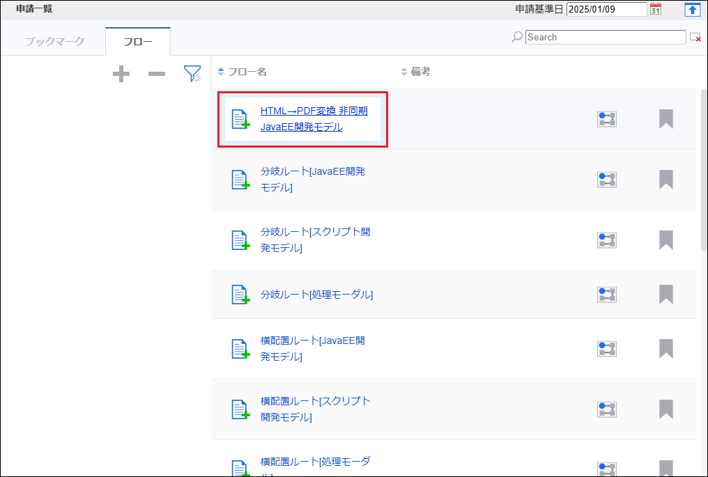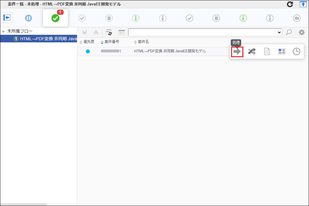 「未処理」タブの一覧から、「 申請する 」で申請した案件を選択し、「処理」アイコンをクリックします。