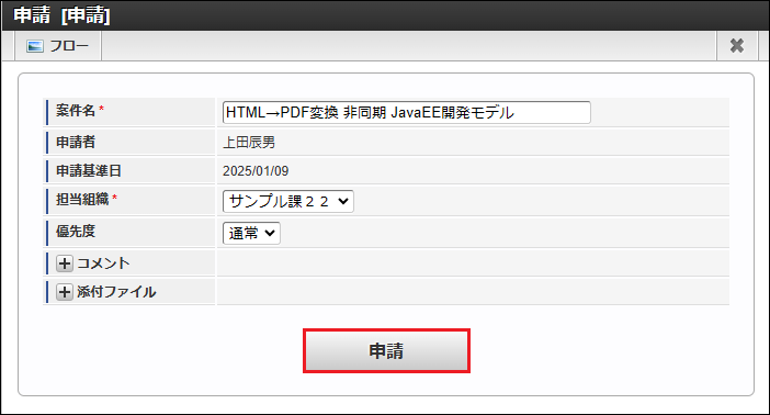 本項目では、 JavaEE開発モデル 用APIを使用したジョブ、および、ユーザプログラムを作成後、 IM-Workflow の案件終了処理としてユーザプログラムを実行し、承認時の処理詳細画面(HTMLファイル)をPDFファイルに変換します。