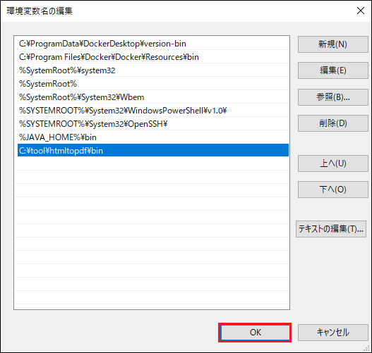 < %HTMLTOPDF_HOME% /bin >のパスを入力し、「OK」をクリックします。