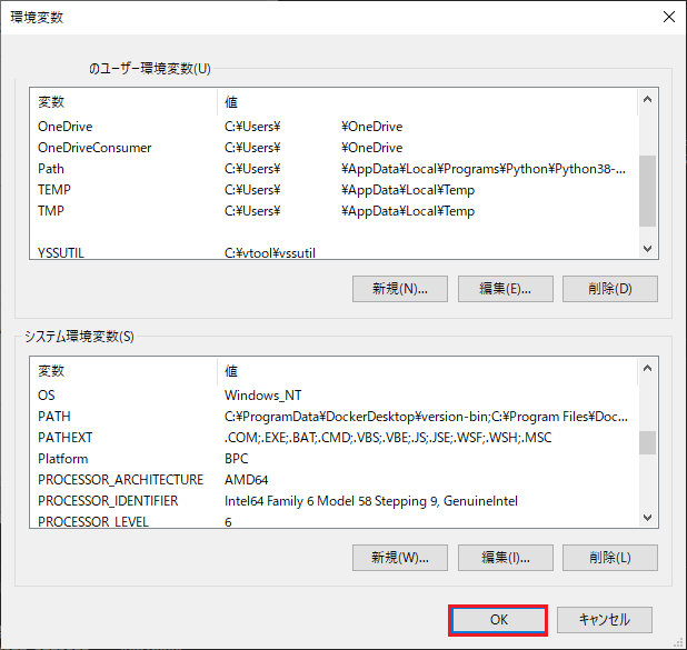 「環境変数」画面が表示されるので、「システム環境変数」-「PATH」を選択し、「編集」をクリックします。