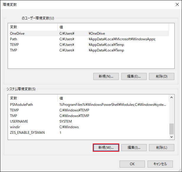 「環境変数」画面が表示されるので、「システム環境変数」-「新規」をクリックします。