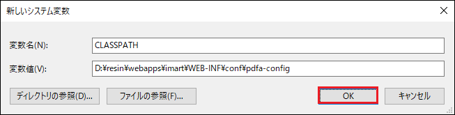 変数名 変数値 CLASSPATH %RESIN_HOME%/webapps/{warファイルと同名のディレクトリ}/WEB-INF/conf/pdfa-config