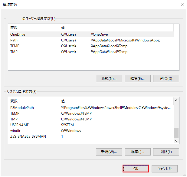 「新しいシステム変数」画面が表示されるので、設定ファイルのパスに関する環境変数を入力し、「OK」をクリックします。