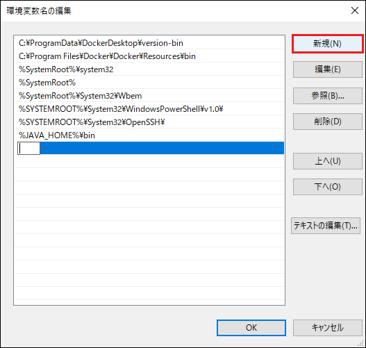 「環境変数名の編集」画面が表示されるので、「新規」をクリックします。