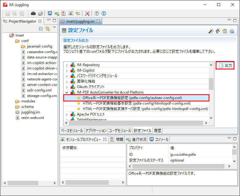 「 IM-PDFAutoConverter for Accel Platform 」-「 Office系→PDF変換 機能設定 」を選択し、「出力」をクリックします。