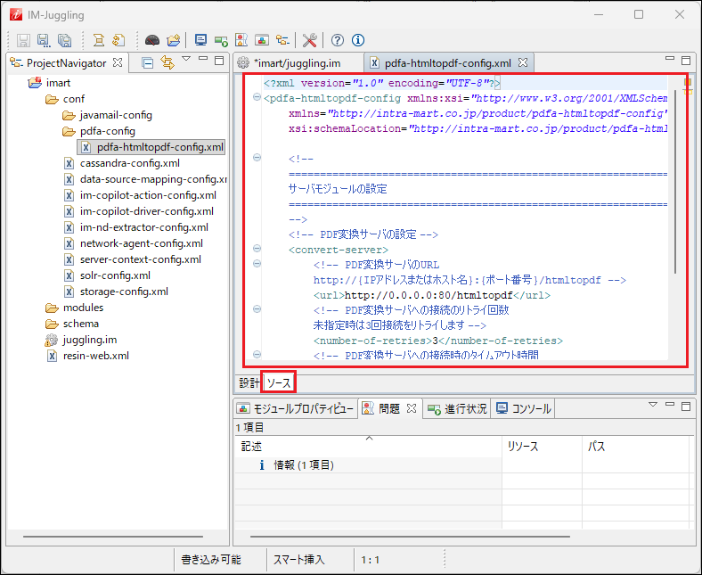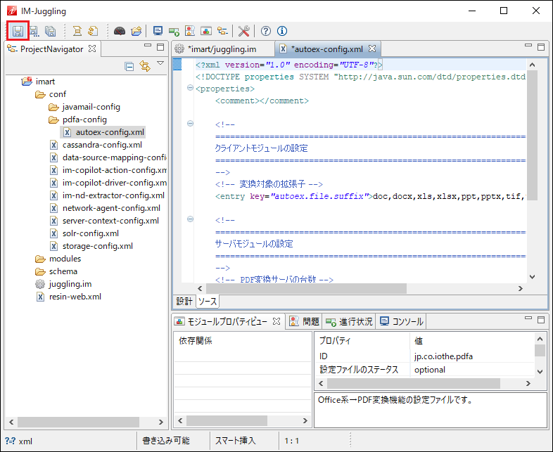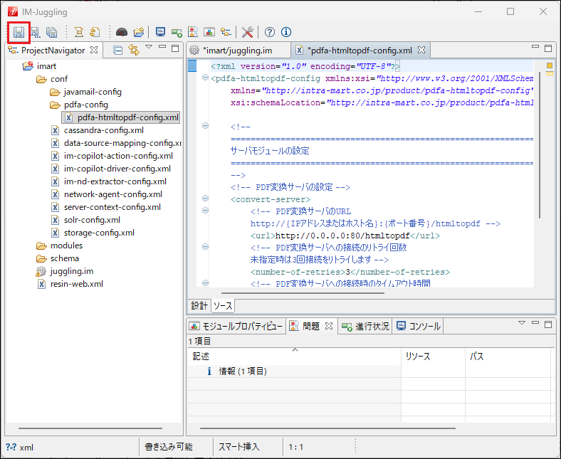 項目名 説明 必須/任意 初期値 <convert-server> PDF変換サーバ に関する設定 必須 ― /<url> PDF変換サーバ のアドレス 必須 http://0.0.0.0:80/htmltopdf /<number-of-retries> PDF変換サーバ への接続のリトライ回数 任意 3 /<connection-timeout> PDF変換サーバ へ接続する際のタイムアウト時間(秒) 任意 60 /<socket-timeout> PDF変換サーバ への接続後のタイムアウト時間(秒) 任意 200 「保存」アイコンをクリックし、保存します。