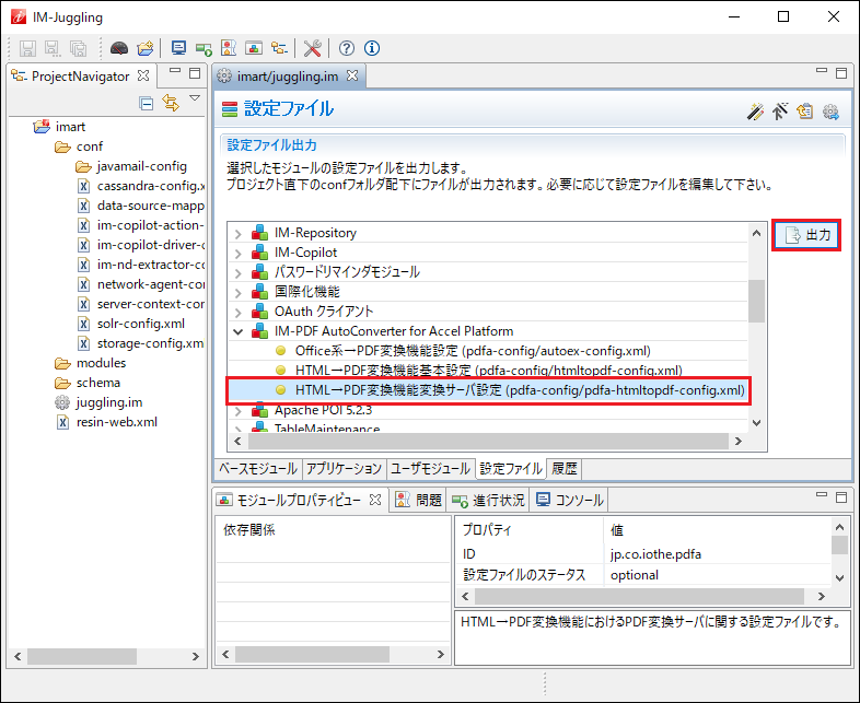 「 IM-PDFAutoConverter for Accel Platform 」-「 HTML→PDF変換 機能変換サーバ設定 」を選択し、「出力」をクリックします。