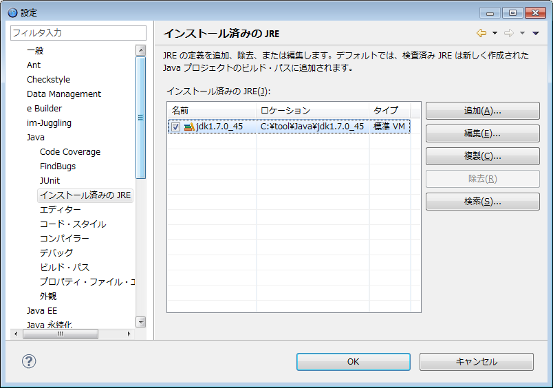 ウィンドウ→設定→Java→インストール済みのJRE を開きます。