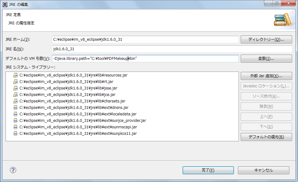 デフォルトのVM引数に PDFメイクアップ のインストール先bin フォルダを指定します。