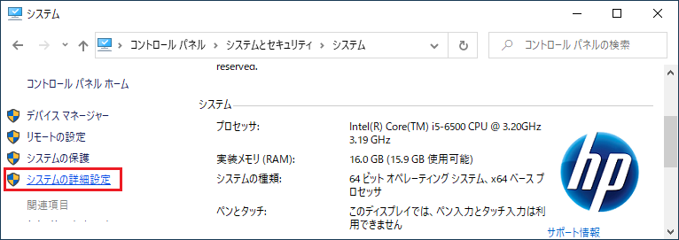 「コントロールパネル」-「システムとセキュリティ」-「システム」-「システムの詳細設定」をクリックします。