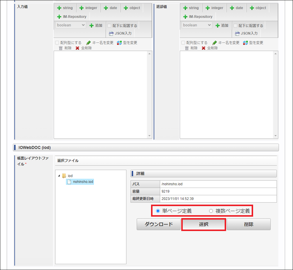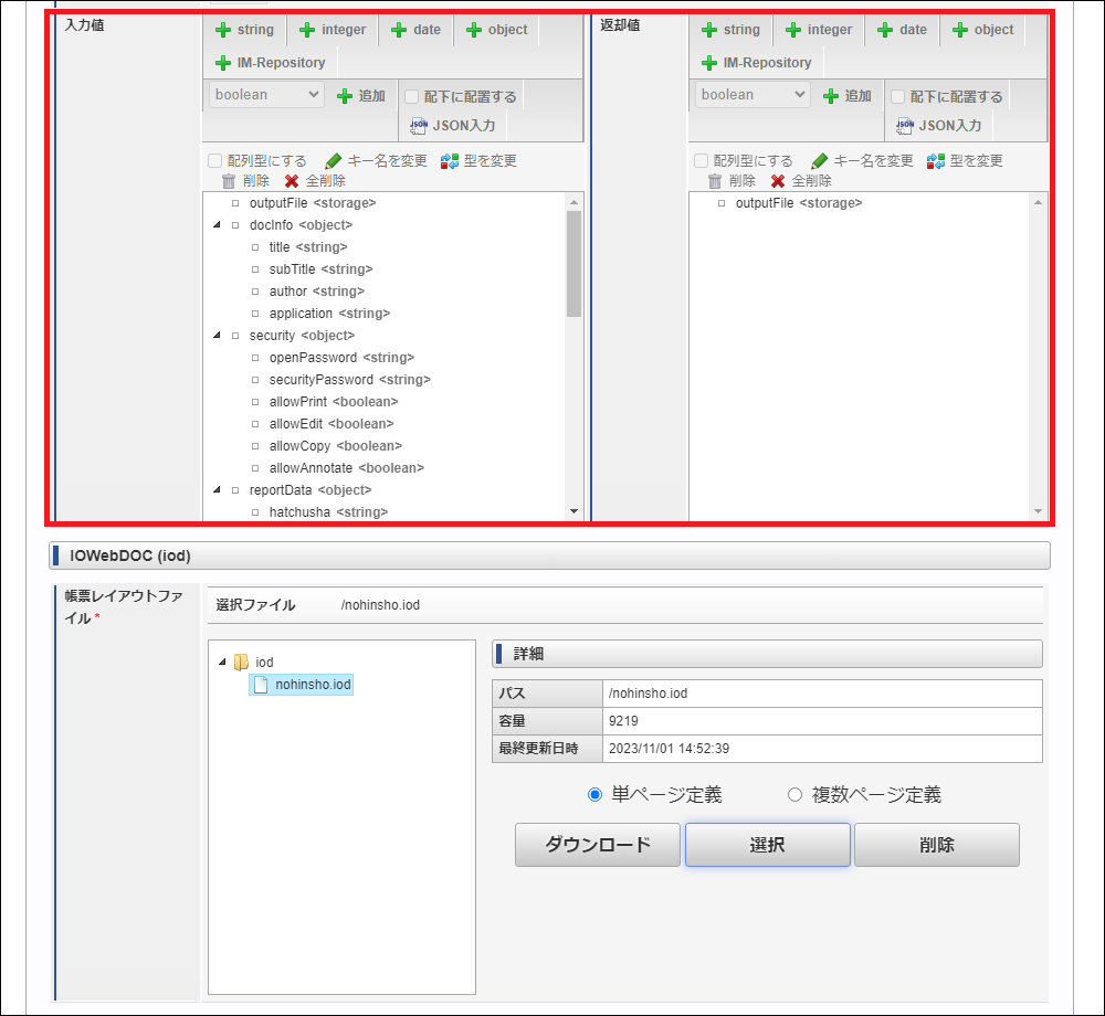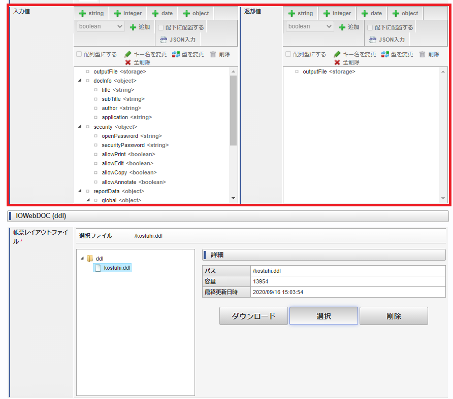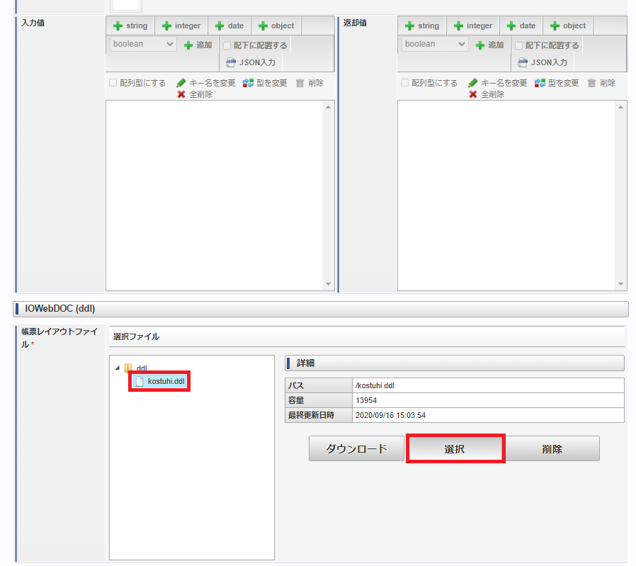 選択した帳票レイアウトファイルの「入力値」、および、「返却値」が自動生成されます。