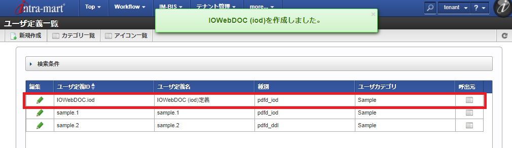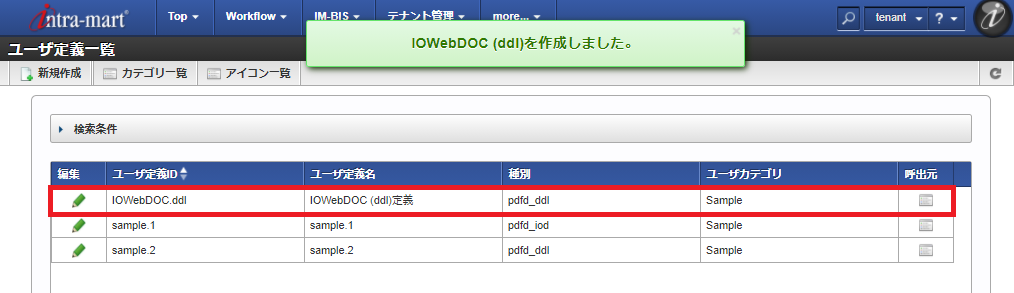 メッセージが表示され、「ユーザ定義一覧」画面に作成したユーザ定義が追加されます。