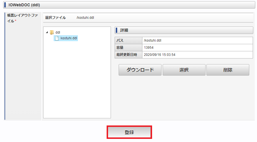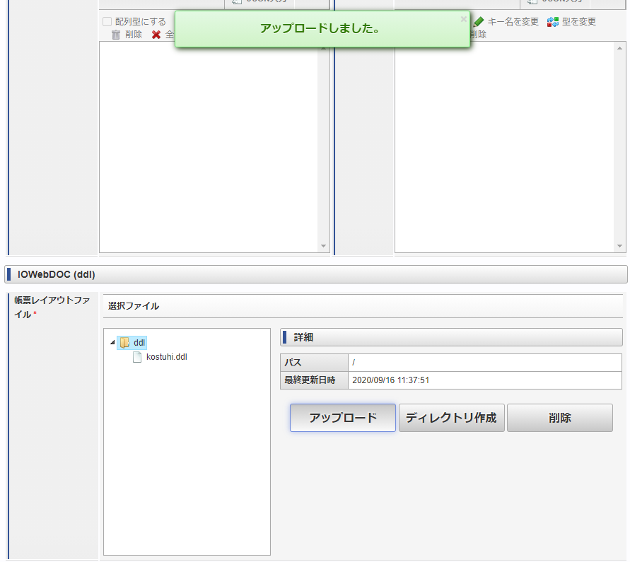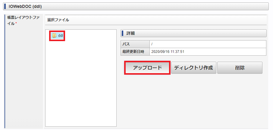 「 IOWebDOC (ddl)」-「帳票レイアウトファイル」のファイルツリー上でディレクトリを選択し、「アップロード」ボタンをクリックします。