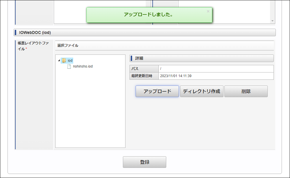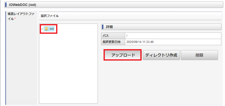 「 IOWebDOC (iod)」-「帳票レイアウトファイル」のファイルツリー上でディレクトリを選択し、「アップロード」ボタンをクリックします。