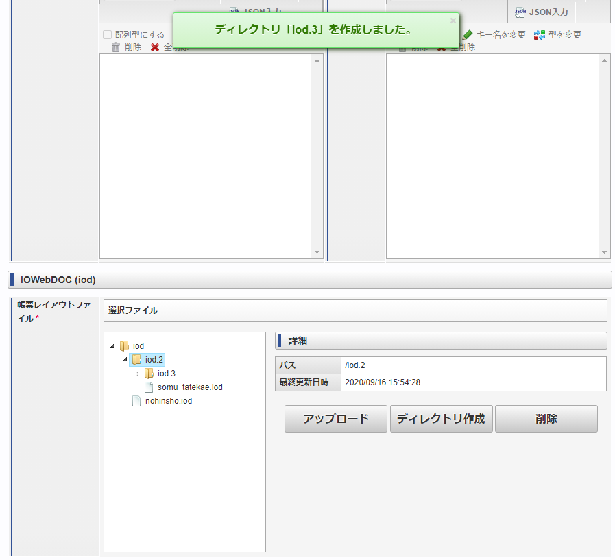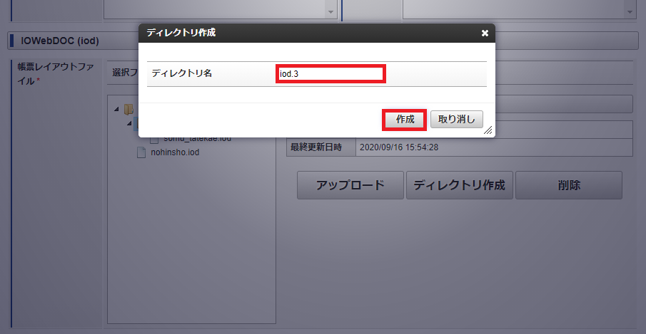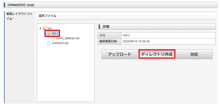 「 IOWebDOC (iod)」-「帳票レイアウトファイル」のファイルツリー上で、新規作成するディレクトリの親ディレクトリを選択し、「ディレクトリ作成」ボタンをクリックします。