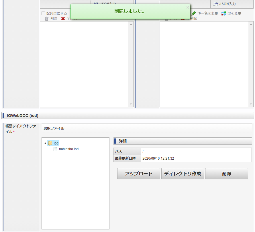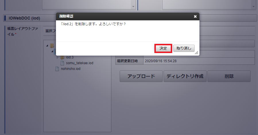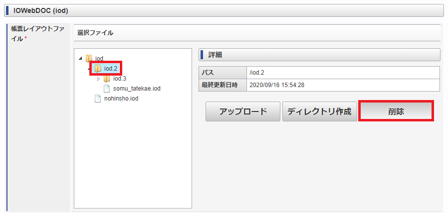 「 IOWebDOC (iod)」-「帳票レイアウトファイル」のファイルツリー上で削除するディレクトリ、および、ファイルを選択し、「削除」ボタンをクリックします。