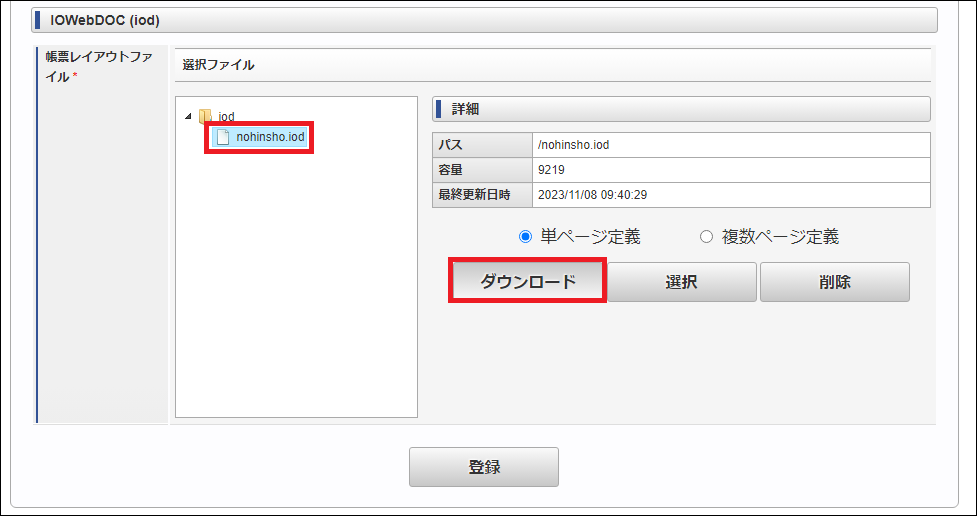 「 IOWebDOC (iod)」-「帳票レイアウトファイル」のファイルツリー上でダウンロードするファイルを選択し、「ダウンロード」ボタンをクリックします。