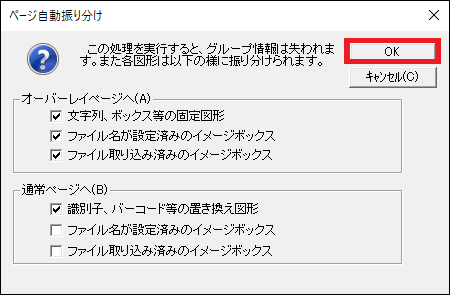 ページ自動振り分け機能とは、固定図形、置き換え図形などのオブジェクトを、通常ページとオーバーレイページに自動で振り分ける機能です。