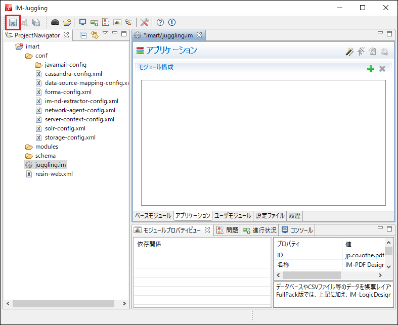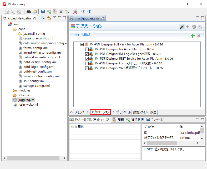 IM-Juggling でプロジェクトを開き、「juggling.im」-「アプリケーション」タブを表示します。