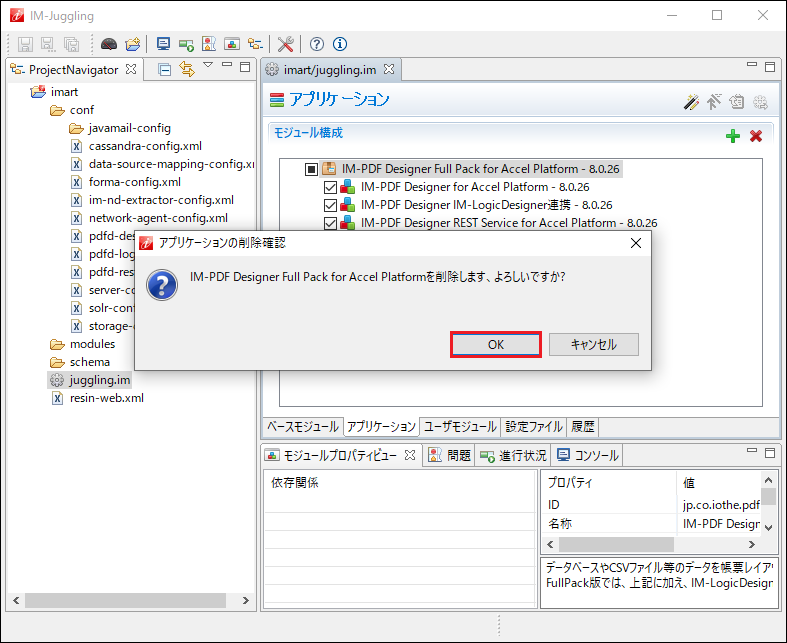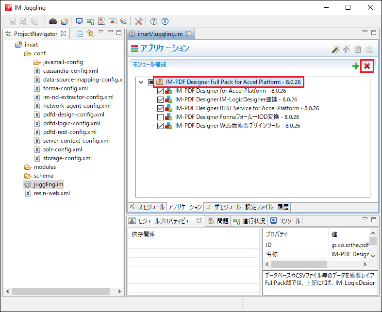 プロジェクト作成時にアプリケーションから IM-PDFDesigner for Accel Platform を除外することで、 IM-PDFDesigner for Accel Platform は削除されます。