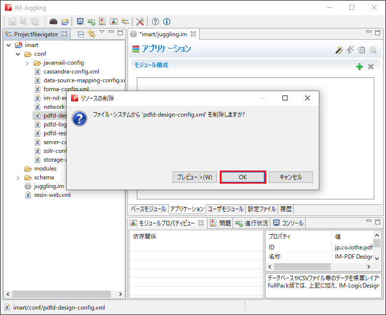 モジュール ファイル名 FullPack版 Web版帳票デザインツール イントラマート連携 pdfd-design-config.xml FullPack版 IM-LogicDesigner 連携 pdfd-logic-config.xml REST Service pdfd-rest-config.xml 削除の確認メッセージが表示されるので、「OK」をクリックします。