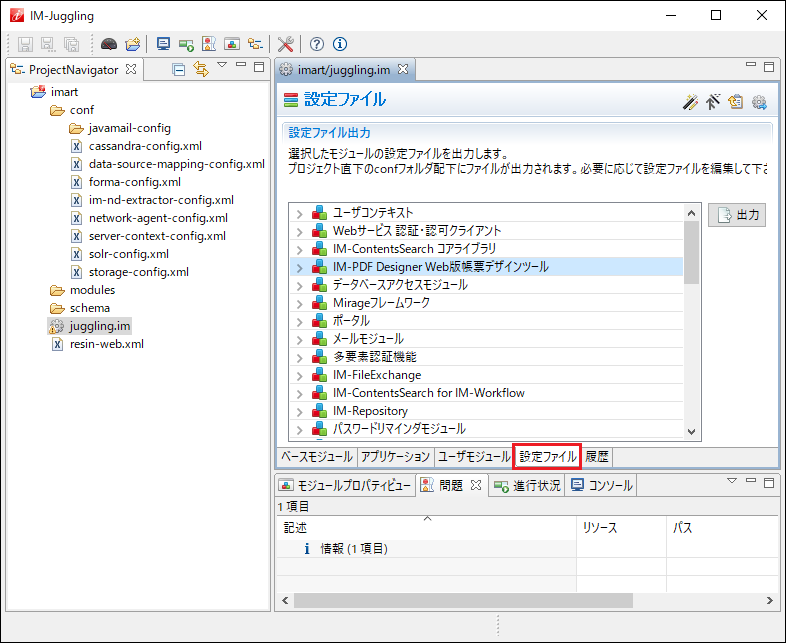 IM-Juggling でプロジェクトを開き、「設定ファイル」タブを表示します。