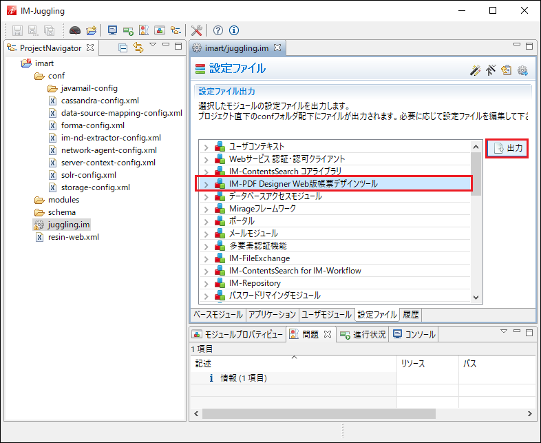 「 IM-PDFDesigner Web版帳票デザインツール 」を選択し、「出力」をクリックします。