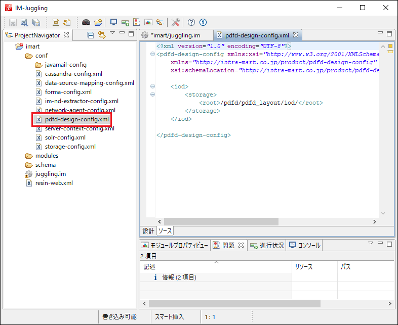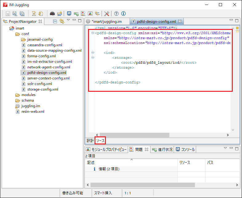 「ソース」タブをクリックし、環境に合わせて< pdfd-design-config >内の設定を編集します。