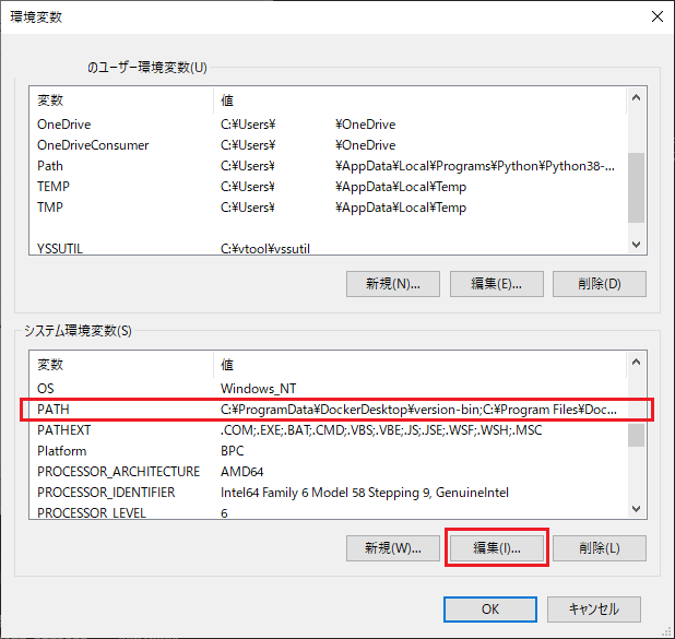 「環境変数」画面が表示されるので、「システム環境変数」-「PATH」を選択し、「編集」をクリックします。
