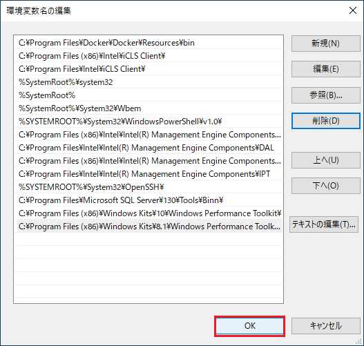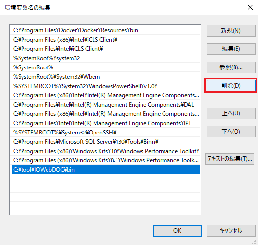 「環境変数名の編集」画面が表示されるので、< %IOWEBDOC_HOME% /bin >のパスを選択し、「削除」をクリックします。