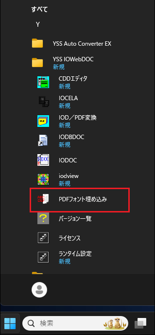 「スタート」からアプリの一覧を表示し、「YSS IOWebDOC 」-「PDFフォント埋め込み」をクリックします。