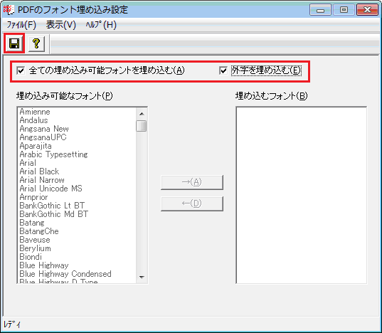 「全ての埋め込み可能フォントを埋め込む」と「外字を埋め込む」にチェックをし、「保存」アイコンをクリックします。