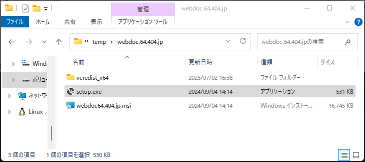 圧縮ファイルを解凍後、< setup.exe >を実行します。
