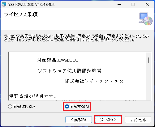 ライセンス条項を確認後、「同意する」にチェックし、「次へ」をクリックします。