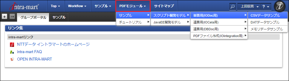 サンプルデータの投入手順については、「 intra-mart Accel Platform セットアップガイド 」-「 サンプルデータの投入 」を参照してください。