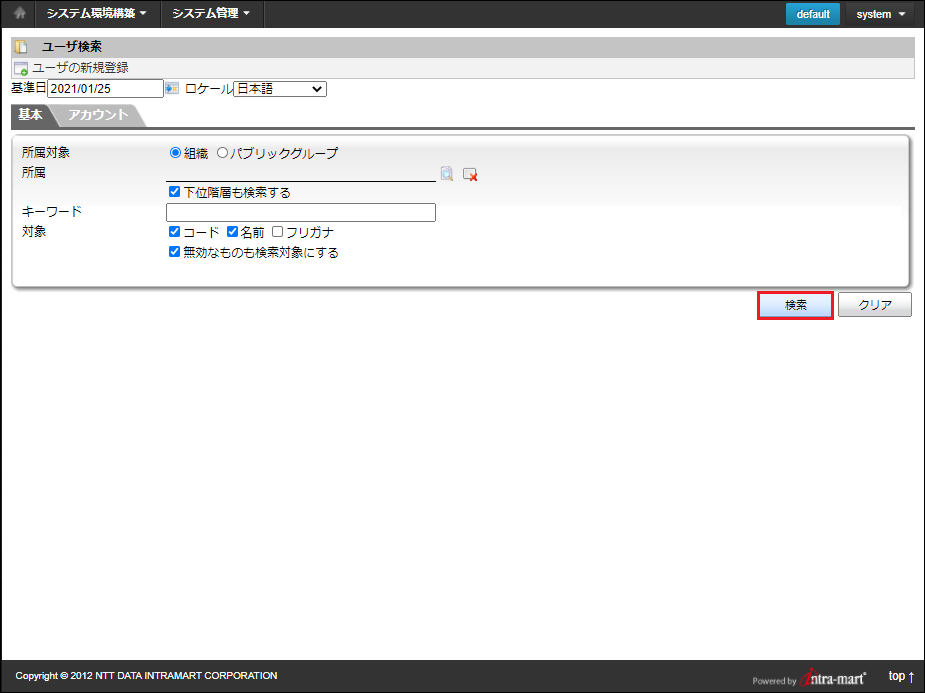 「ユーザ検索」画面が表示されるので、「検索」をクリックします。
