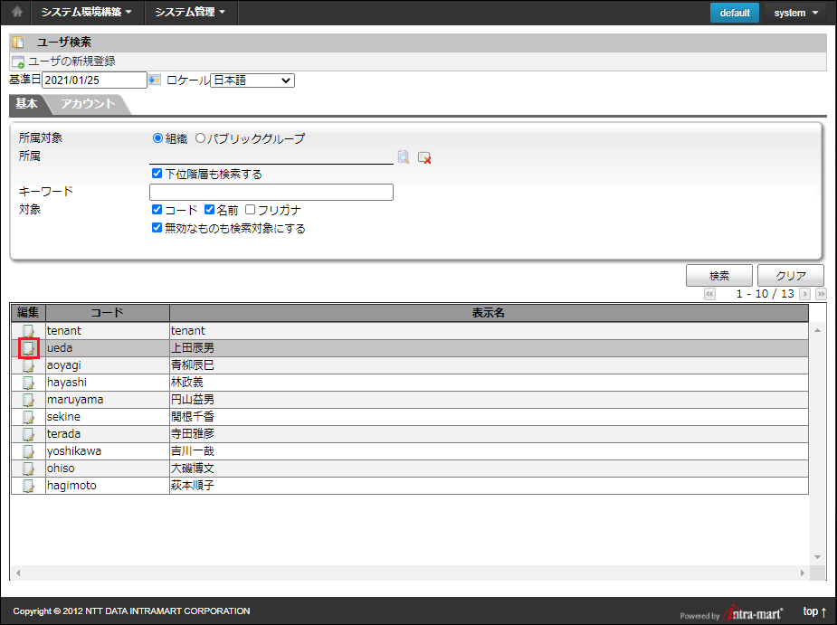 次の例は、デフォルトユーザの< ueda >に PDFデザイナー管理者< pdfsuper > を追加した場合です。