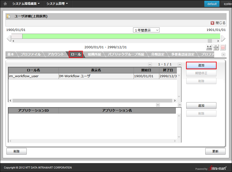 「ユーザ詳細」画面が表示されるので、「ロール」タブ -「追加」をクリックします。