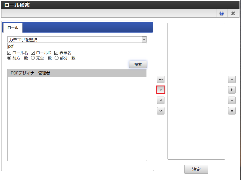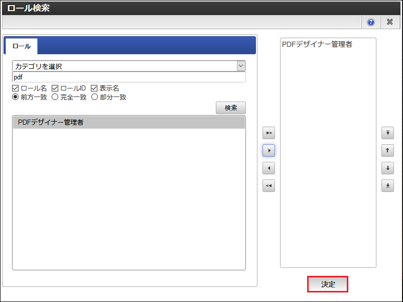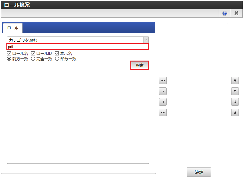 「ロール検索」画面が表示されるので、「pdf」と入力し、「検索」をクリックします。