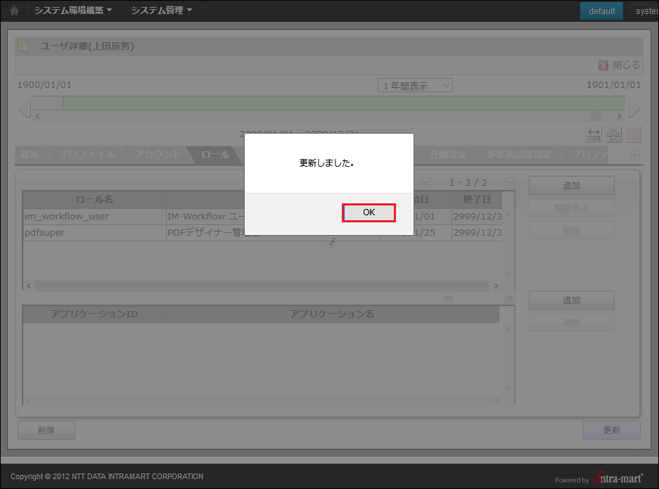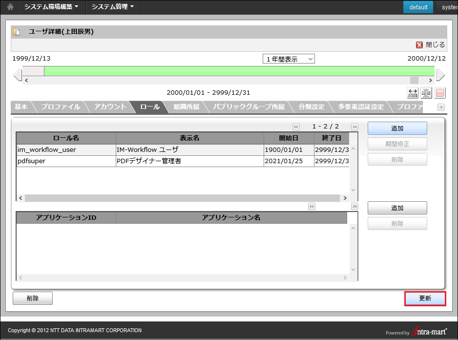 ロール一覧に PDFデザイナー管理者< pdfsuper > が追加されたことを確認し、「更新」をクリックします。