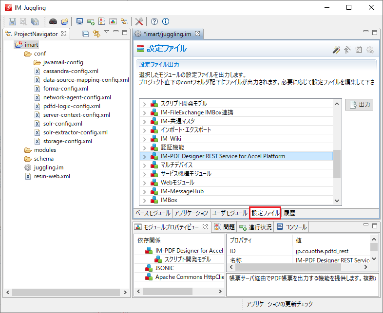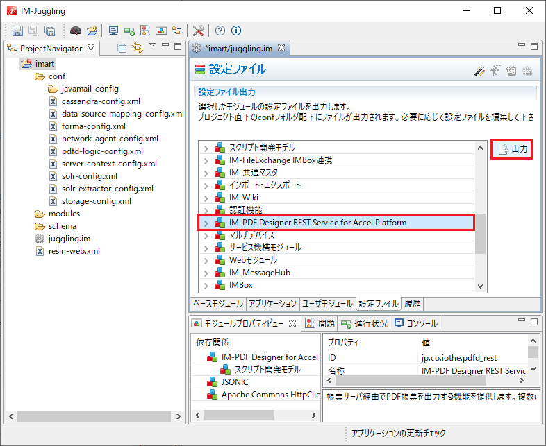 「IM-PDF Designer REST Service for Accel Platform」を選択し、「出力」をクリックします。