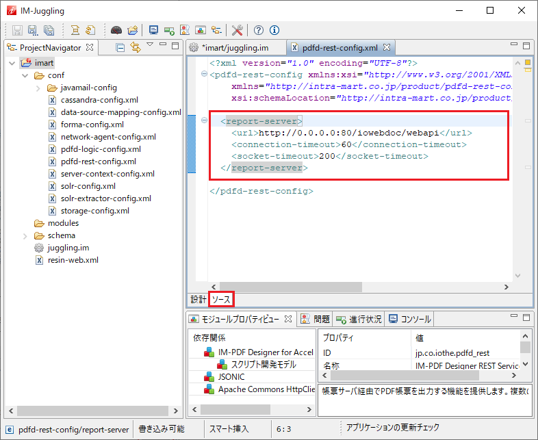 「ソース」タブをクリックし、環境にあわせて< report-server >内の設定を編集します。