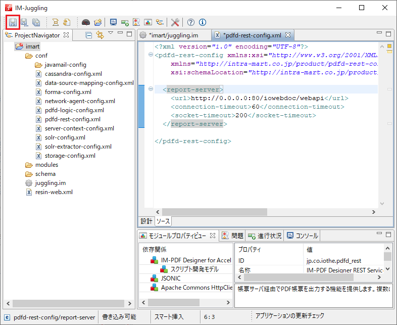 項目名 説明 必須/任意 初期値 <url> PDF帳票サーバ に設置したアプリケーションのURLを指定します 必須 http://0.0.0.0:80/iowebdoc/webapi <connection-timeout> PDF帳票サーバ に設置したアプリケーションへの接続が確立されるまでの待機時間を指定します。(単位:秒) 任意 60 <socket-timeout> PDF帳票サーバ に設置したアプリケーション接続後の待機時間を指定します。(単位:秒) 任意 200 「保存」アイコンをクリックし、保存します。