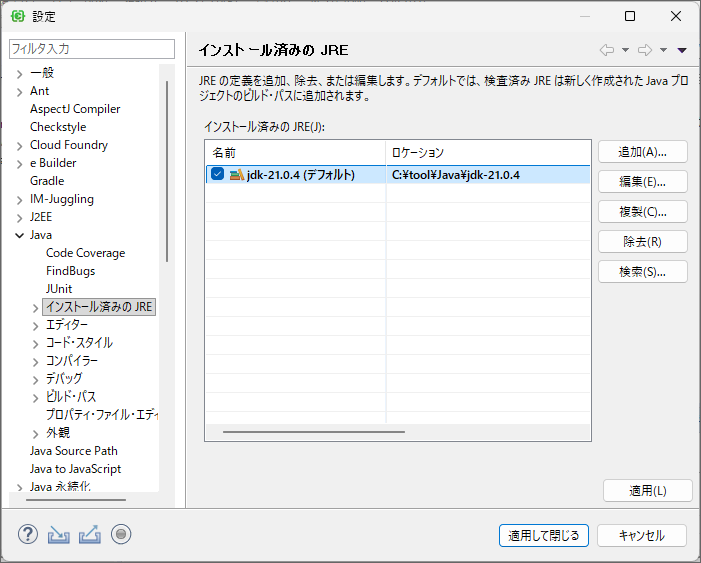 設定画面から「Java」-「インストール済みのJRE」を選択します。