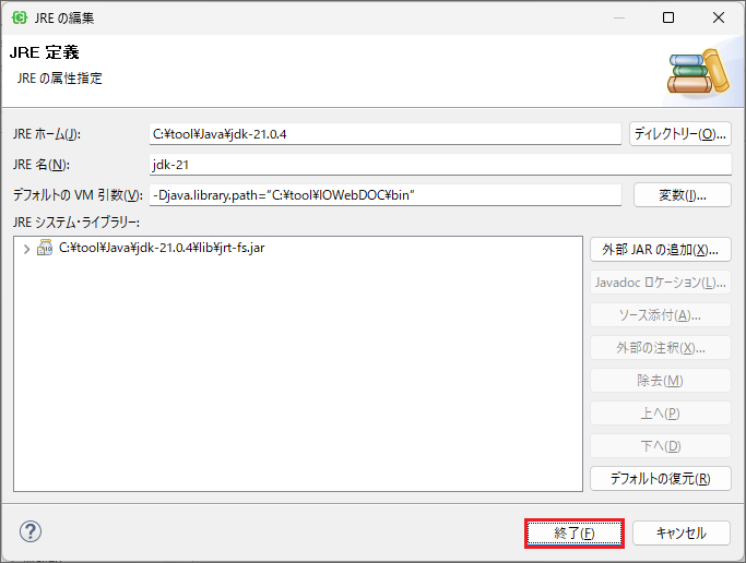 「デフォルトのVM引数」に、次のように< %IOWEBDOC_HOME% /bin >を指定します。