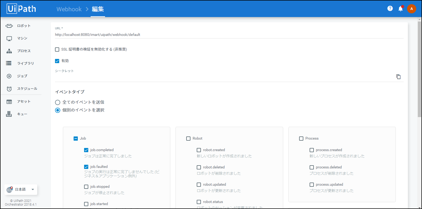 テナント名を自動解決する場合http(s)://<%ホスト名%>:<%ポート番号%>/<%コンテキストパス%>/uipath/webhook テナント名を指定する場合http(s)://<%ホスト名%>:<%ポート番号%>/<%コンテキストパス%>/uipath/webhook/<%テナント名%>シークレット 「設定ファイル」で記述したシークレット(共通鍵)を設定してください。イベントタイプ 「個別のイベントを選択」を選択し、「UiPath連携でのWebhook」に記載のイベントの種類の中から任意のものを選んでください。