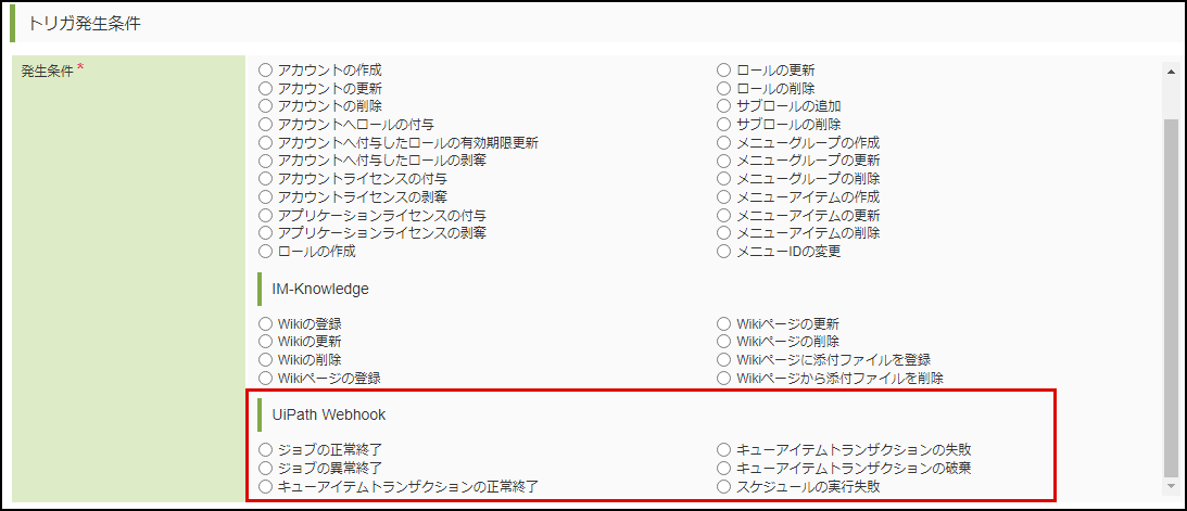 有効にしたWebhookイベントの種類に対応したIM-LogicDesignerトリガ定義を作成することで、UiPath Orchestratorが送信したWebhookに反応して任意のロジックフローを実行できます。IM-LogicDesignerトリガ定義の作成方法については、「IM-LogicDesigner ユーザ操作ガイド」 - 「トリガ定義を新規登録する」を参照してください。以下の項目については説明のように設定してください。